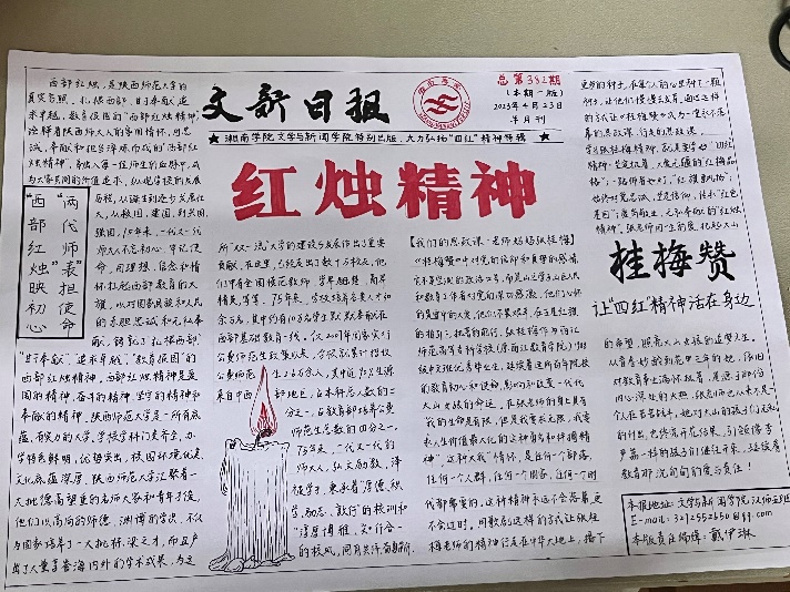 4月22日举办了“红色与青春”书写活动,4月28日举办了“绘红色底蕴 展专业特色”宣传海报设计比赛,5月9日举办了“星星之火 绽放芳华”红色故事宣讲大赛,5月24日举办了“书信情深载忠魂 纸短情长促担当”红色书信诵读比赛……通过形式多样的比赛,促进了同学们对“四红”精神的理解,引导学院学生充分结合专业特色并发挥想象力,当好红色文化的弘扬者、践行者。