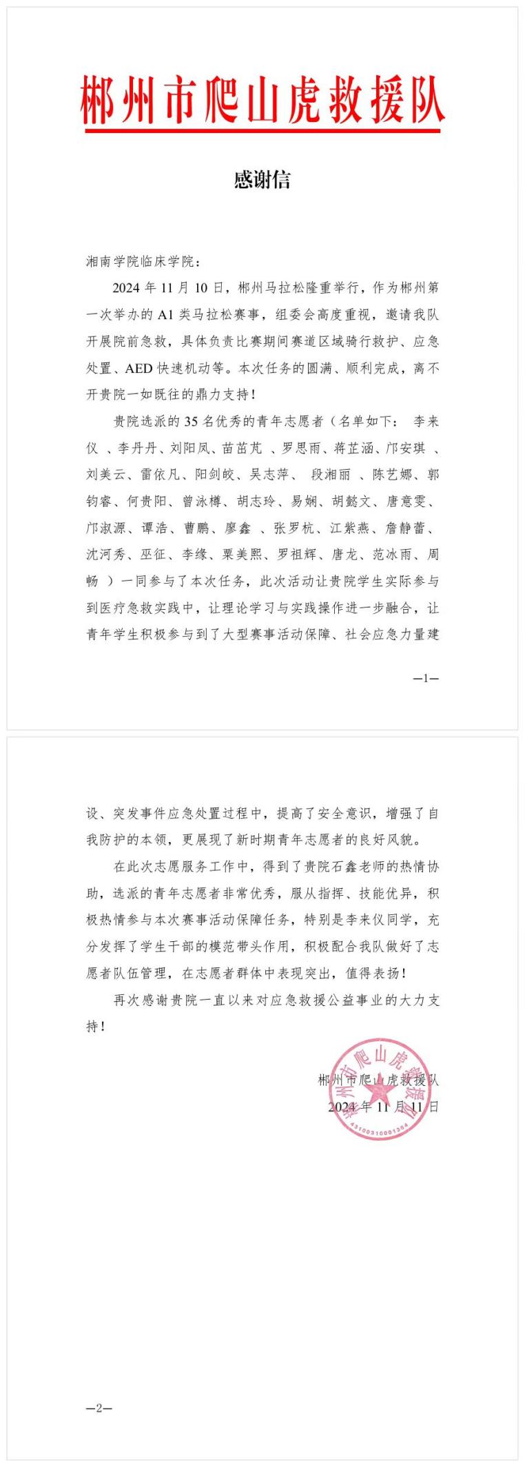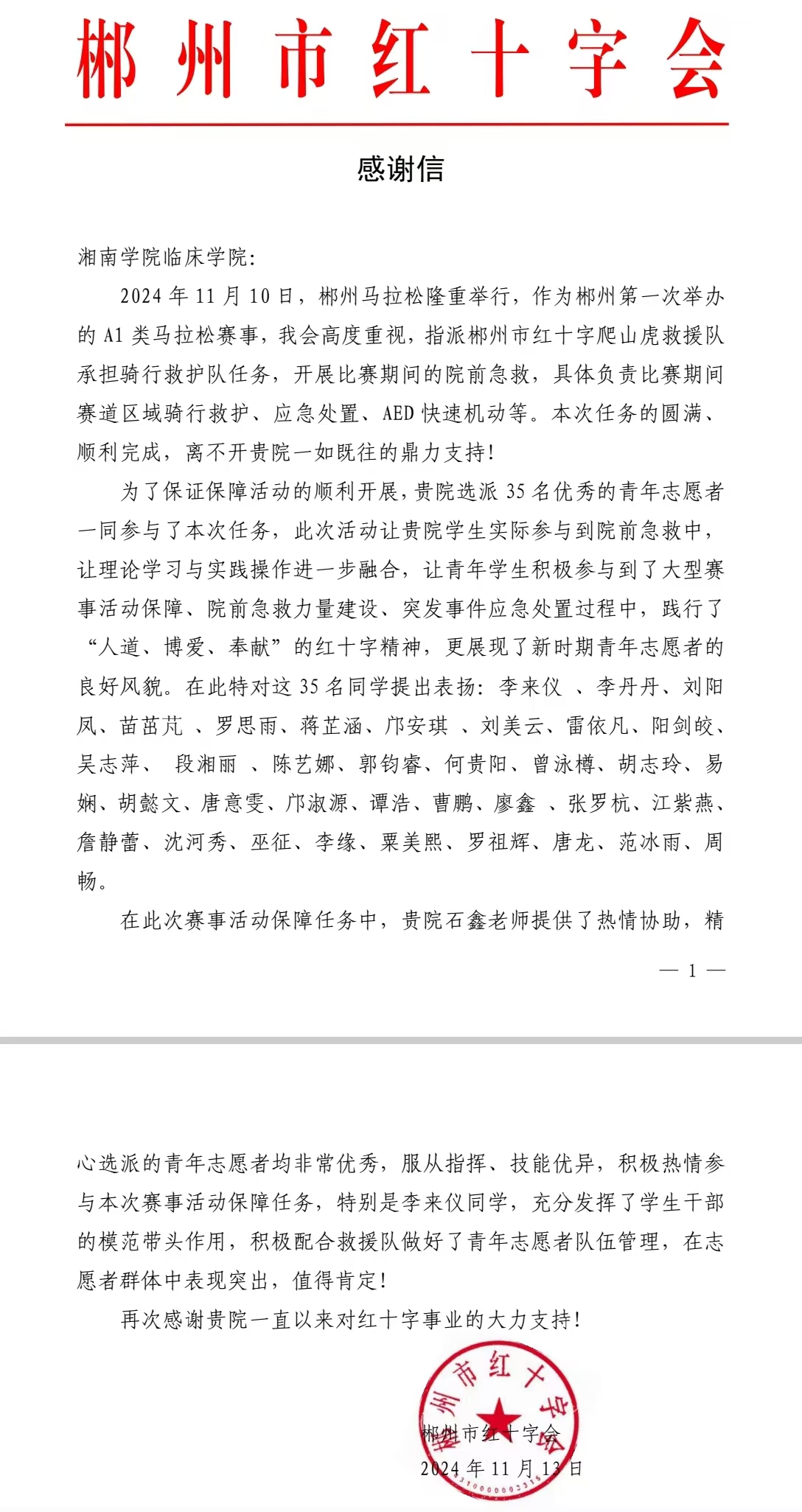 本网讯(通讯员 李来仪)近期,临床学院收到来自郴州市红十字会和爬山虎救护队分别寄出的两封感谢信。信中表达了对学院学生志愿者在此次郴州首届马拉松担任骑行救护队,负责比赛期间赛道区域骑行救护、应急处置、AED 快速机动,保障参赛选手生命安全的感谢。