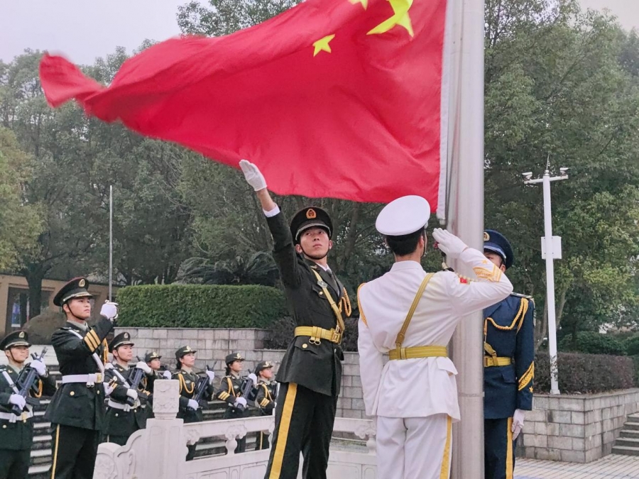 同学们面向清晨朝阳,国旗护卫队迈着整齐一致的步伐,护送国旗至升旗台。在高亢激昂的国歌声中,五星国旗从升旗台中缓缓升起。全体师生肃立,向国旗行注目礼。
