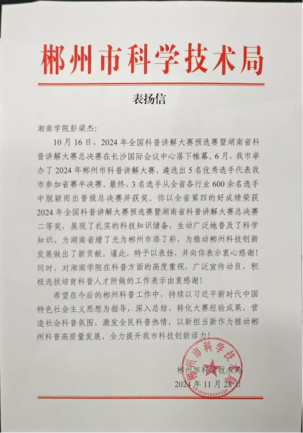 表扬信中提到,彭梁杰的获奖不仅是对他个人努力和才华的认可,更是对湘南学院一直以来致力于科普工作的高度肯定。湘南学院基础医学院通过健康科普进校园、社区、企业和乡村等多种活动形式,积极推广科普知识,提高公众科学素养,取得了显著成效。