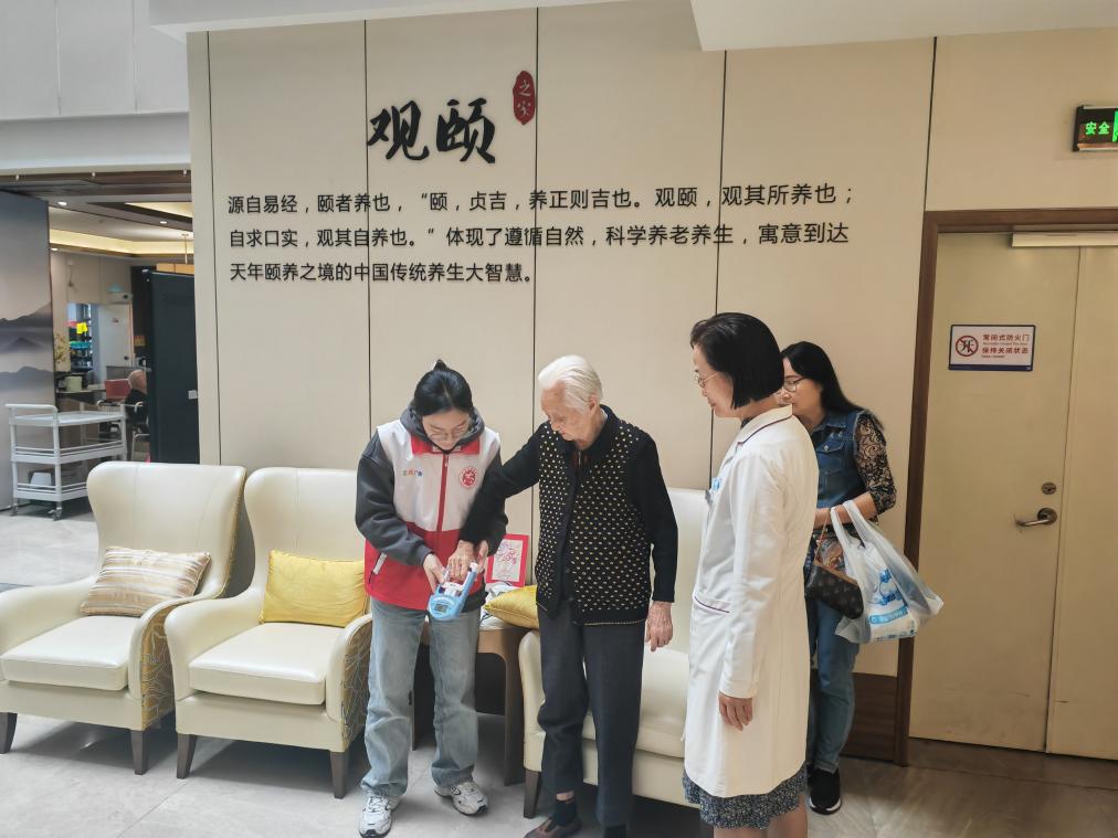 12月12日,在老年医学科老师的带领下,志愿者们参观了蛇口颐养中心,了解了中心内老年人的基本情况。为顺利完成志愿活动,志愿者们随机分成三组,第一组志愿者负责为老年人测量血压、臂围和腿围;第二组志愿者负责测量老人们的体脂率;第三组志愿者负责评估老人们的肌肉力量和耐力。此外,志愿者们还记录了老人们的步速数据,结合以上测试结果,志愿者们对老人们的健康状况进行了综合分析并给予健康生活指导。