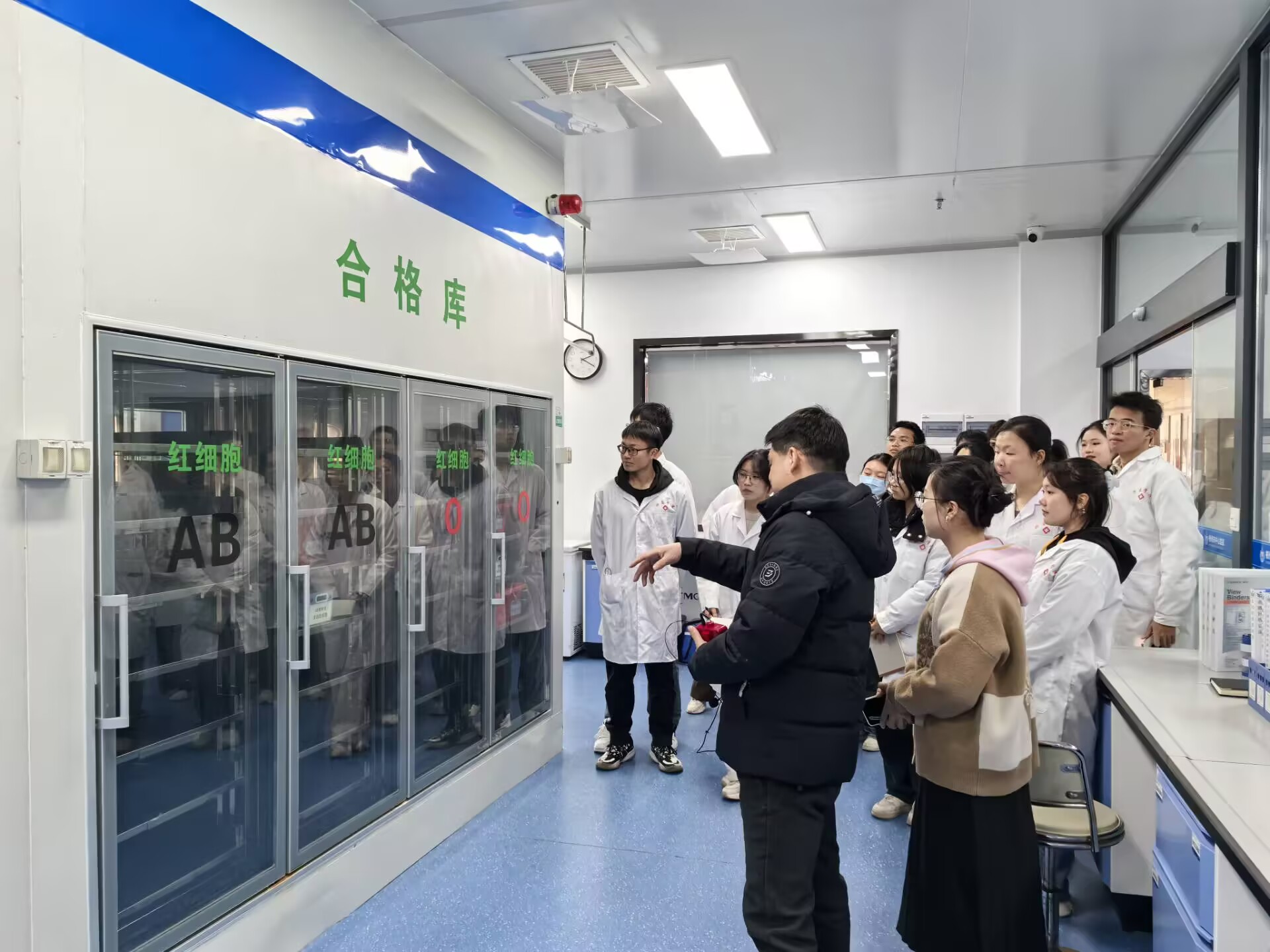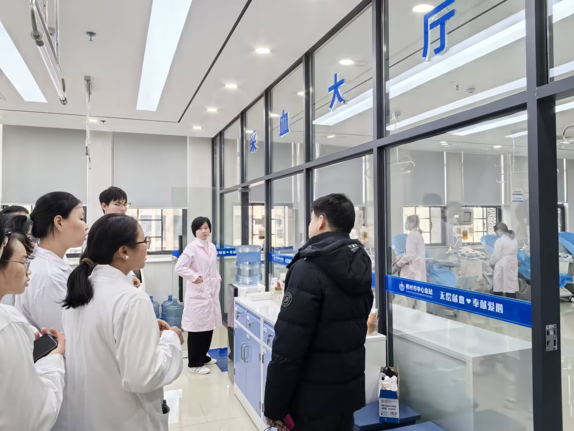 在郴州市中心血站工作人员的陪同讲解下,师生们依次参观了发血科、机采科、成分科和检验科等科室,全方位了解血液采集、成分分离、病原检验、分类储存和运输全过程。同时,学生们还观看了无偿献血公益宣传片,深化了对无偿献血的认识。