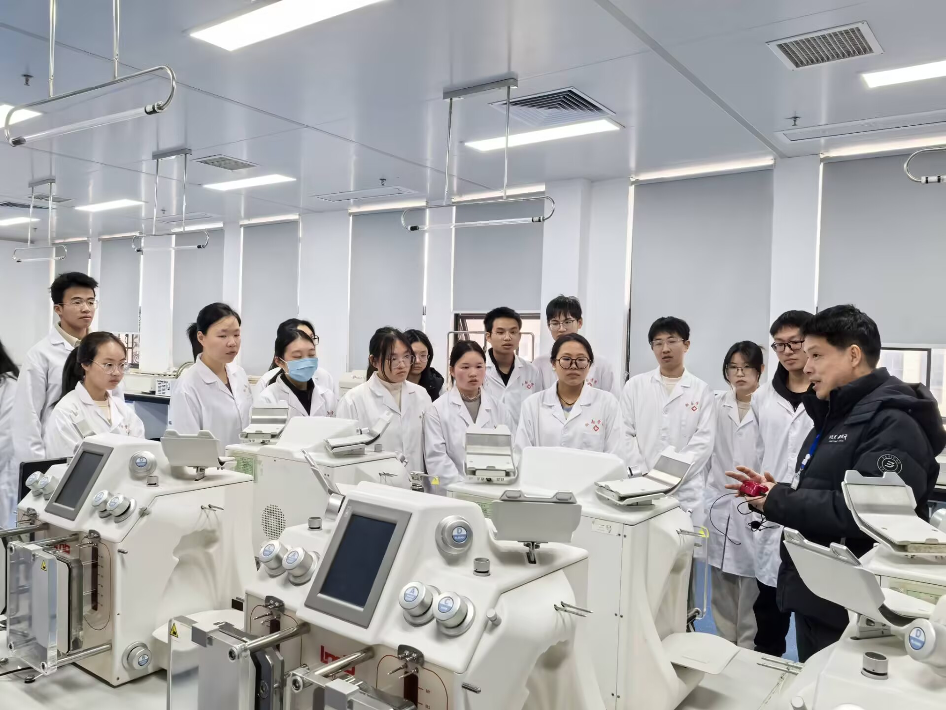 在此期间,师生们近距离观察了血液成分采集和分离、病原抗原及抗体酶联免疫检测和病原核酸检测等精密仪器和自动化工作台。通过程序化分部处理,有效分离全血中的红细胞、血浆凝血因子、血小板等成分,以满足临床不同的输血需求。