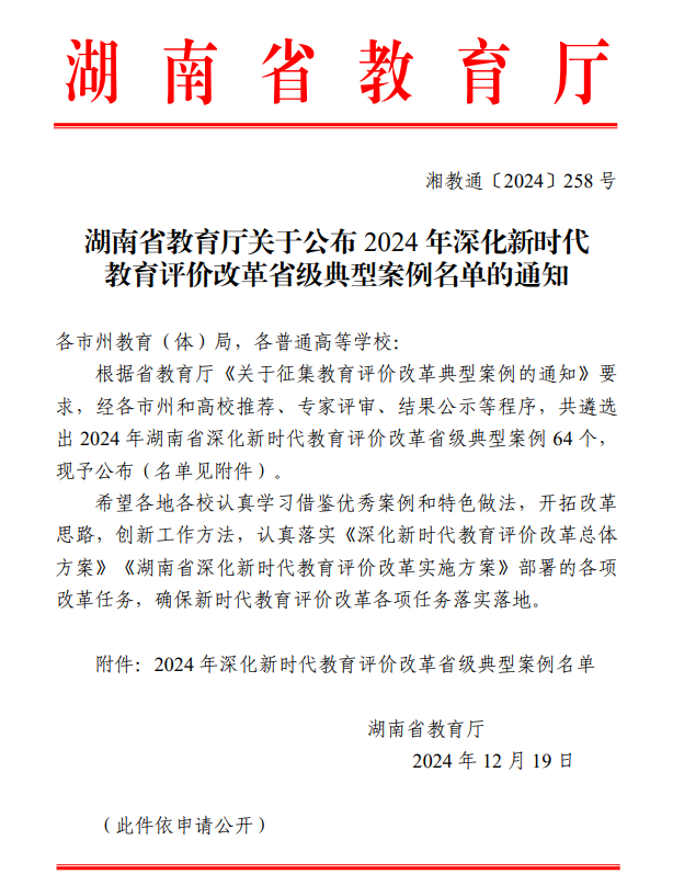 本网讯(通讯员 张琳瑜 周旅娟)近日,从湖南省教育厅传来喜讯,我校临床学院(附属医院)的“构建以学为中心的智能化评价体系”成功入选 “2024 年深化新时代教育评价改革省级典型案例”。