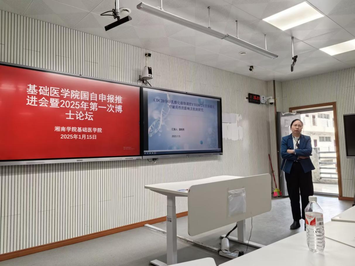 本网讯(通讯员 李旭)1月15日上午,基础医学院举办了2025年国自申报指导推进会暨2024年第三季度博士论坛,以推进国家自然科学基金项目(简称“国自项目”)的申报工作,促进学院内部学术交流与合作。广东省杰出青年医学人才、博士生导师、暨南大学附属第一医院教授谭明会受邀到会指导,基础医学院全体博士和科研骨干参加此次论坛,基础医学院副院长方会龙主持活动。