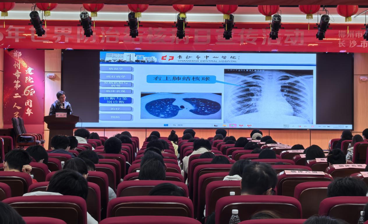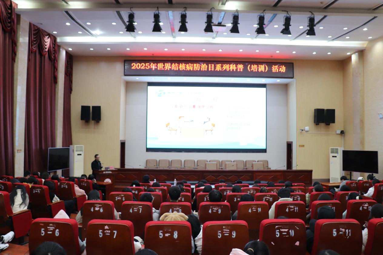3月15日,首场"结核病防治三全"主题科普活动在我校图书馆西报告厅启动。郴州市第二人民医院结核中心主任陈检才以"全球疫情趋势-典型案例解析-全周期管理策略"为主线,通过数字化防控案例强调校园防控的重要性。基础医学院博士李旭主持活动,育蕾科普志愿者协会成员发放《校园结核防控手册》,并进行现场答疑,强化现场师生的防治认知,现场氛围活跃。本次活动通过"专家授课+互动科普+校园动员"三维模式,为构建校园健康防线注入专业力量。