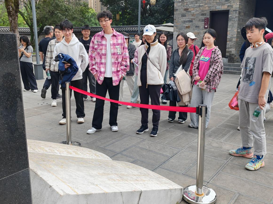 师生们在周敦颐博物馆门前整齐列队,叶丽娟寄语广大学子:“今天的研学活动,希望同学们以先贤为镜,让廉洁成为青春的靓丽底色。”