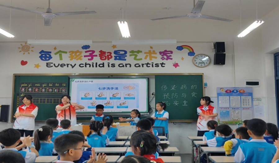 活动中,志愿者以傅连暲将军战时防疫事迹和钟南山院士抗疫经历开篇,结合呼吸道、消化道传染病案例,详细讲解了传播特点和预防要点,并通过现场演示“七步洗手法”,指导孩子们掌握正确清洁步骤和防护技能。