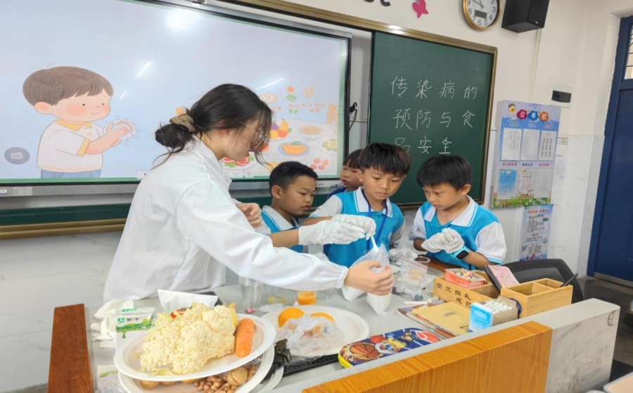 本网讯(通讯员 何铬颖 刘涛)近日,公共卫生学院师生党员走进郴州市六中观山学校,开展“讲好食品安全营养故事,提升全民科学素养”实践活动。通过趣味故事、互动实验、情景表演等创新形式,将《“健康中国2030”规划纲要》及《国民营养计划(2024-2037)》精神转化为生动实践,为孩子们带来了一场生动的健康知识之旅。