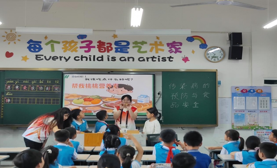 在讲授食品安全环节,志愿者通过图片对比,带领孩子们认识六大营养素,区分健康食品与垃圾食品。随后,“帮我挑挑营养素”互动游戏将现场气氛推向高潮,孩子们积极参与食物分类挑战,在实践中加深对营养素的认知。