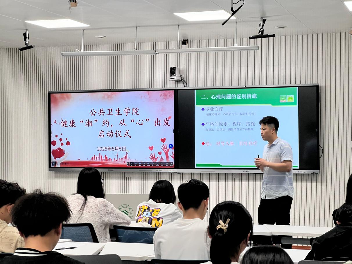 本网讯(通讯员 张大帆 杨芹)为普及心理健康知识,培养学生热爱生活、珍视生命、积极向上的心理品质,提升同学们的心理调适能力,公共卫生学院5月期间开展了“健康'湘'约,从'心'出发”心理健康月系列活动。活动以专题讲座、互动实践、创意工坊等形式展开。