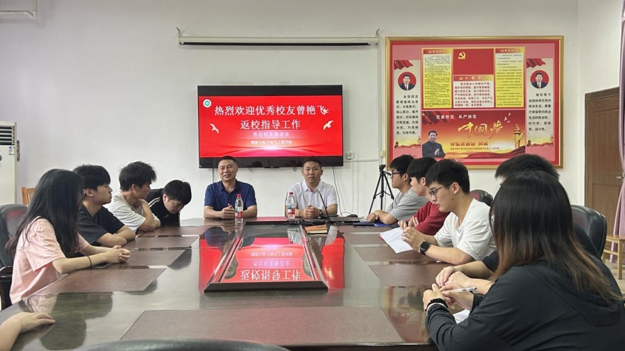 本网讯(通讯员 雷珊 摄影 雷珊) 6月18日,我校物理与电子电气工程学院在创新楼214举办校友座谈会,邀请半导体领域优秀校友曾艳飞返校,与在校师生共叙情谊、共话发展。