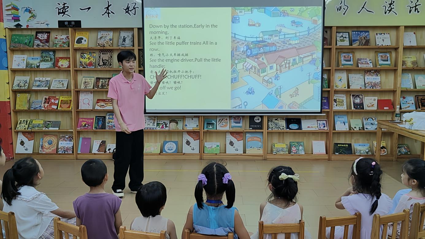 本网讯(通讯员 周诗瑶 浣嘉熙 摄影 严雨馨 刘永平 何思熠)近日,外国语学院“青语筑梦 绿韵同行”社会实践团走进春苗书屋开展英语启蒙教学。团队成员充分发挥专业特长,巧妙运用经典英语绘本,设计了一堂融趣味、互动、启蒙为一体的沉浸式双语课。