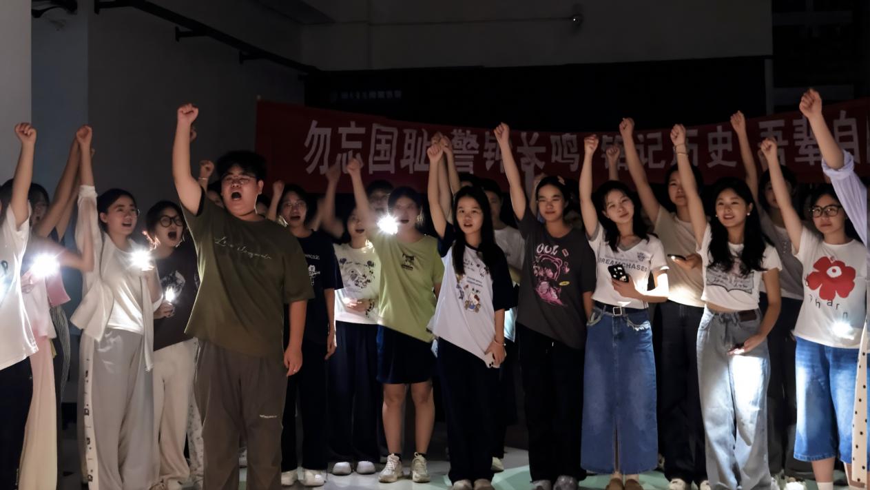 默哀毕,同学们齐喊“勿忘九一八!九一八勿忘!”口号铿锵有力,表达了对历史的深刻铭记,和对民族精神的坚定传承。“九一八,九一八,从那个悲惨的时候,脱离了我的家乡,抛弃那无尽的宝藏……”《松花江上》的悲怆旋律缓缓响起,熟悉的歌词勾起对山河破碎的痛惜;“共产党辛劳为民族,共产党他一心救中国……”《没有共产党就没有新中国》的激昂曲调接续,歌声中饱含着对如今和平生活的珍视,以及对国家发展的坚定信心,全场人员以饱满的情感合唱,将活动气氛推向高潮。