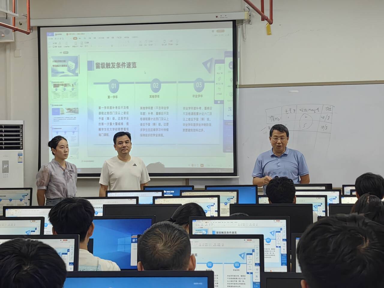 本网讯(通讯员 陈粲然 王柯欣)近期,计算机与人工智能学院党委书记肖建勋带领全体领导班子成员,及23级班主任、辅导员深入各班,开展“学风建设与发展规划”主题班会,进一步巩固学风建设成果,助力2023级学生破解学业瓶颈、明晰发展方向,以“靶向式”指导为大三学子注入成长动能。