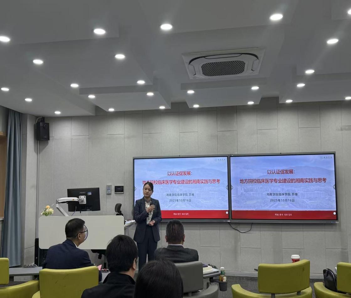 论坛期间,苏维以《以认证促发展:地方院校临床医学专业建设的循证实践与思考》为题作专题报告,从认证导向的专业建设路径出发,系统分享了湘南学院在临床医学人才培养、课程体系建设等方面的实践经验,为同行提供了可借鉴的改革思路。在学术交流环节,苏维还结合湘南学院在“临床医学教育”领域的研究成果,就医学教育与区域健康需求融合提出建议,推动校际间在科研合作、师资共建等方面的潜在合作。