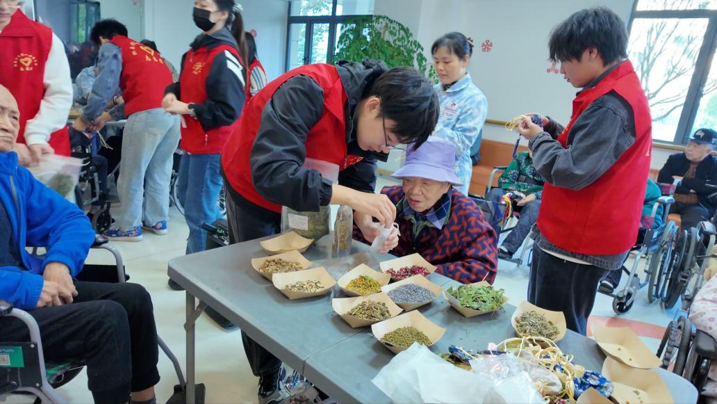 在香囊制作环节中,志愿者们将提前准备好的香料、布料分发给老人,一边讲解香囊的养生意义,一边协助老人穿针引线、填充香料,一个个精致的香囊在互动中完成,也让老人们感受到手工制作的乐趣与温暖。