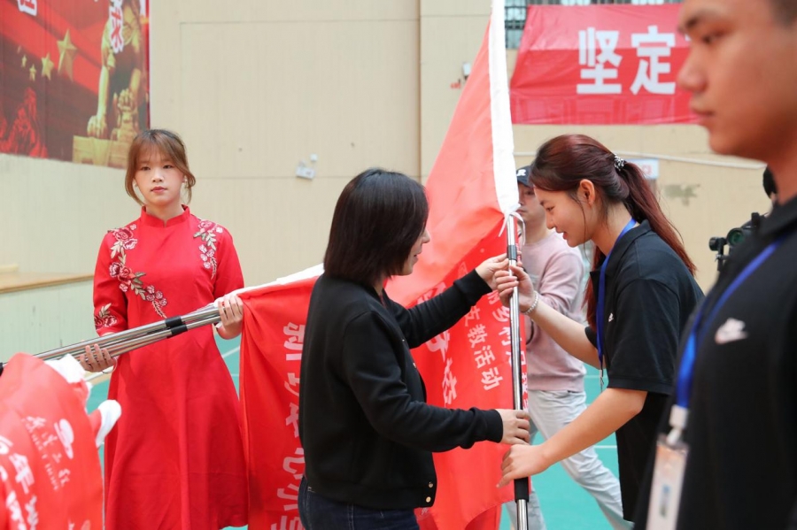 喻慕鸿、陈洛丹等与会领导为志愿者授旗。全体志愿者高举右拳、齐声宣誓,生动诠释着湘南学院新时代青年服务教育、服务乡村的新担当。