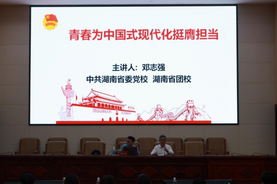 湖南省团校副校长邓志强为青马班学员作《青春为中国式现代化挺膺担当》专题授课。他围绕“新时代青年为何要挺膺担当”“挺膺担当的具体实践领域”“新时代青年如何挺膺担当”三方面展开深入讲解。针对当前复杂的国内外形势,他强调,新时代青年必须坚定理想信念,勇于担当作为,在危机面前挺身而出,在责任面前勇于承担。他还分析了当代中国面临的六大风险挑战,并指出青年学子应当在科技创新、乡村振兴、绿色发展、社会服务、卫国戍边等重点领域主动作为,为推进中国式现代化贡献青春智慧与力量。