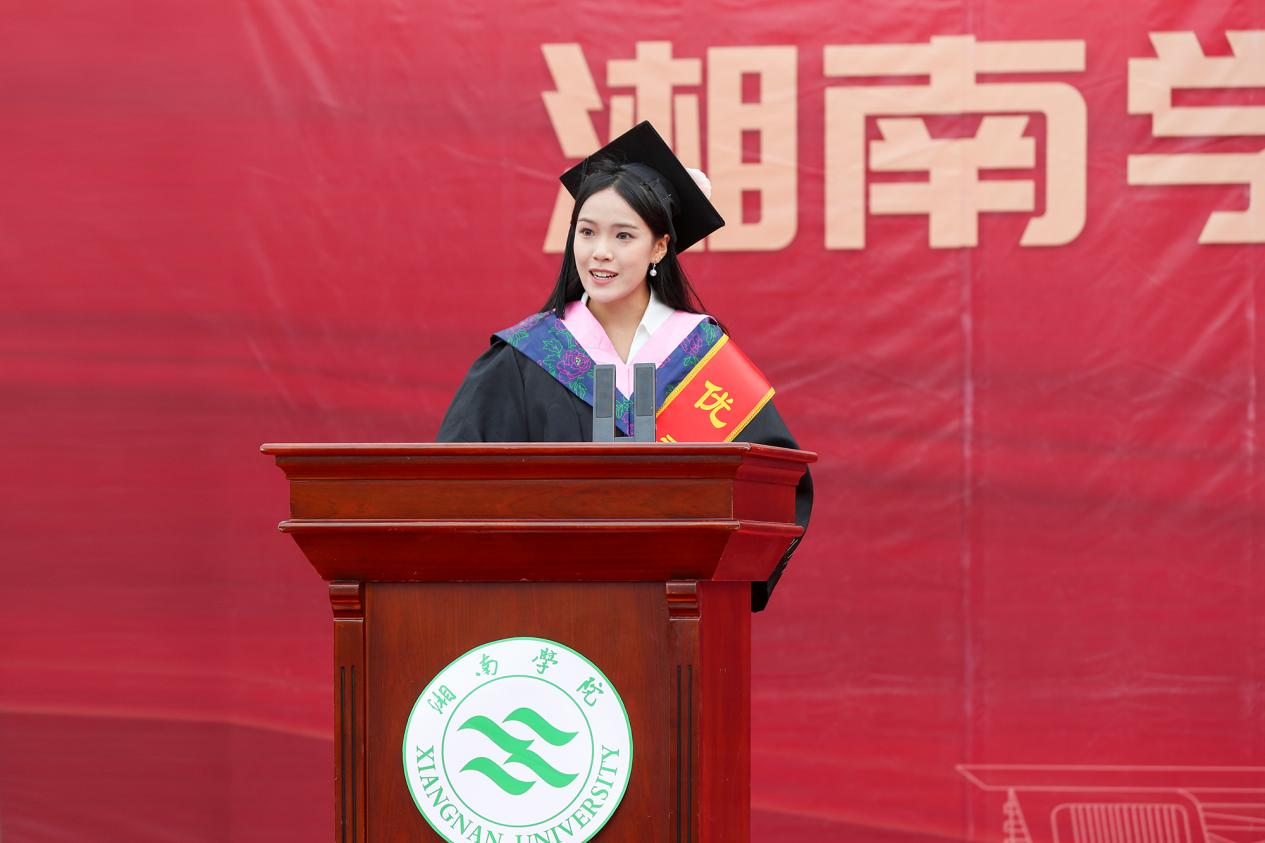“原来,从初入校园的懵懂少年到即将远航的追梦人,不过是转瞬之间。蓦然回首,王仙岭下的点点滴滴,即将封存为珍贵的记忆……”学生代表、音乐学院播音与主持艺术专业2025届毕业生何蓉回顾大学四年的生活,表达了对母校和恩师的感激,并对同期毕业生送上美好祝愿。