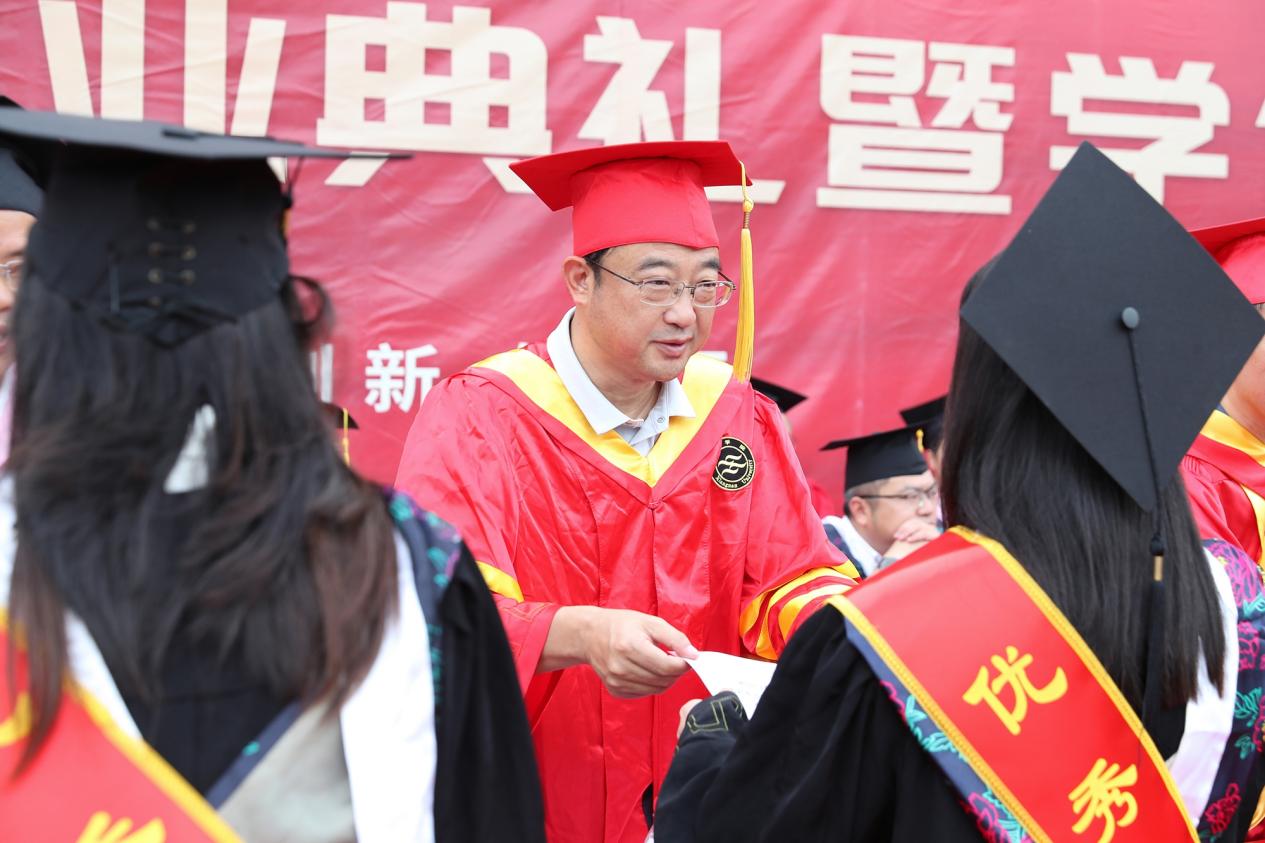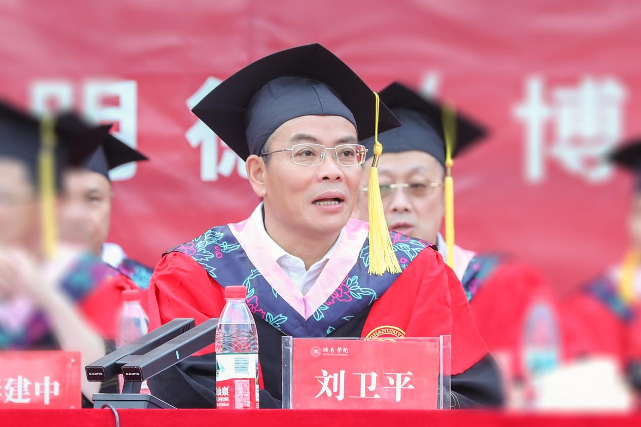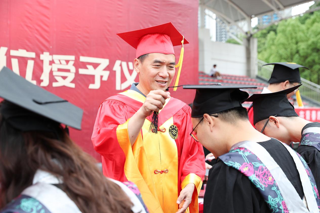 刘卫平主持毕业典礼。“流苏定格左肩,从此山高水长”,他祝全体毕业生青云万里,前程似锦,山水万程,皆有所愿。