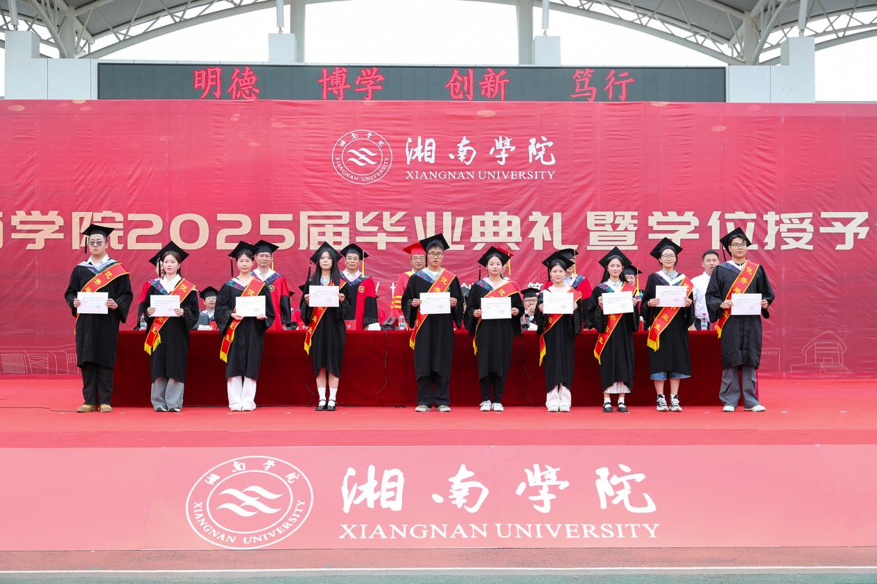学士学位授予仪式上,2025届毕业生们身着整齐的学位服,怀着激动的心情,上台接受校领导和学士学位评定委员会委员们拔穗、授学位,并合影留念。