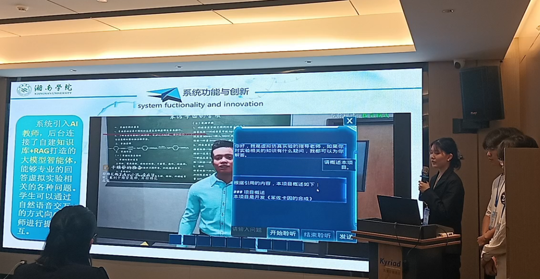 据悉,该项目由计算机科学与技术专业学生胡兆潜、舒海洋及药学专业学生张雪婷、尹帅、黄金瑶共同完成。团队深度融合计算机技术与化工制药知识,药学院学生负责实验设计与优化,计算机与人工智能学院学生完成三维建模与UE5虚拟仿真平台开发。作品创新引入大模型+RAG技术实现3D虚拟教师实时语音交互,凭借出色的技术呈现获评委高度评价。
