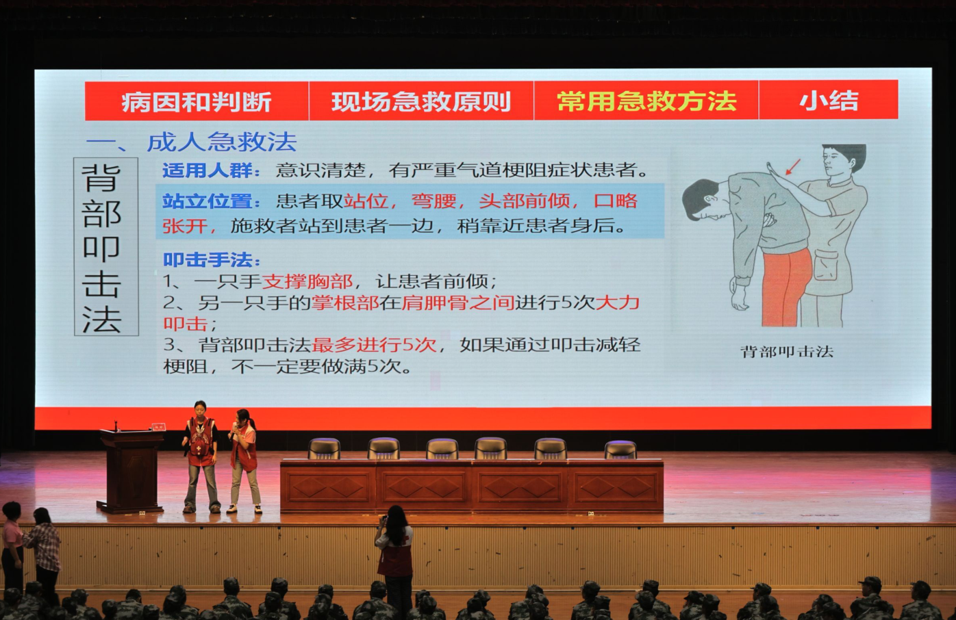 活动分为讲座和实践演练两个环节,围绕气道异物梗阻急救、心肺复苏与AED使用、创伤包扎、预防传染病知识四个模块开展。