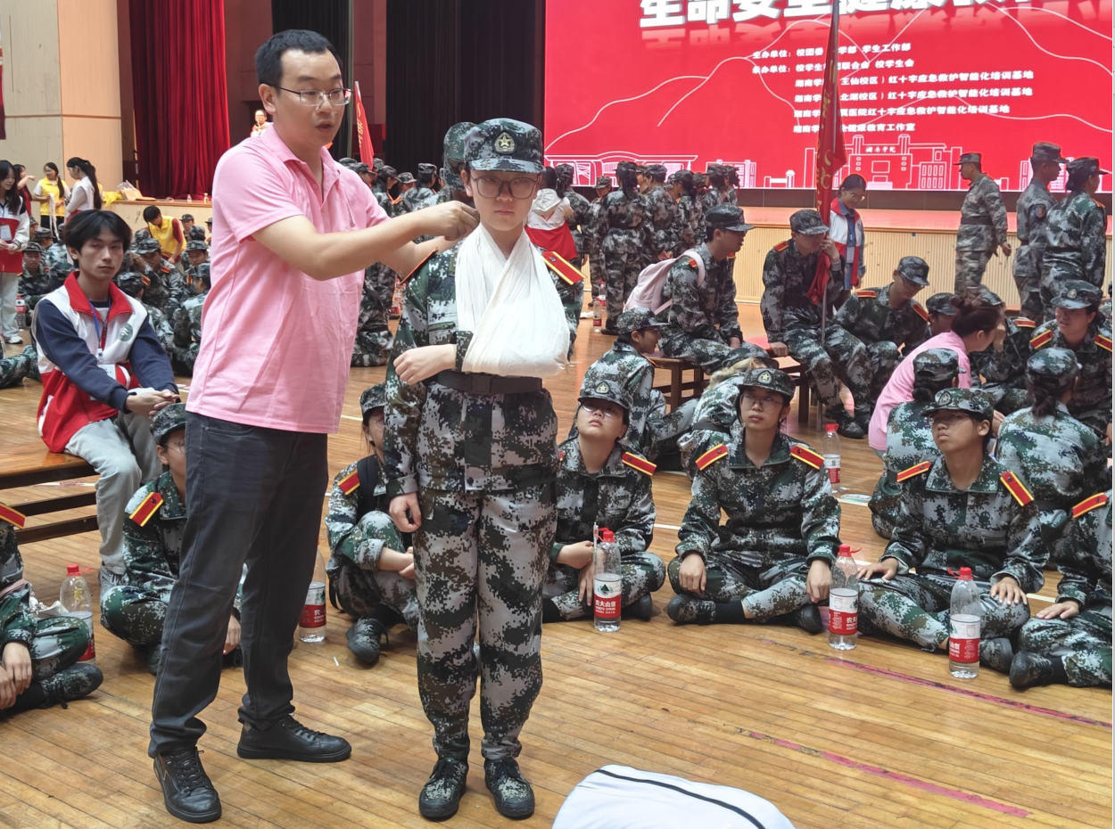 讲座环节,护理学院教师向新生们普及了气道异物梗阻急救方法;医学部教师进行了心肺复苏与AED使用专题讲解;湘南学院第一附属医院急诊科副主任结合实际案例,讲解创伤包扎的注意事项;公共卫生学院教师通以“讲解+演示”的方式,为新生们科普传染病防治知识。