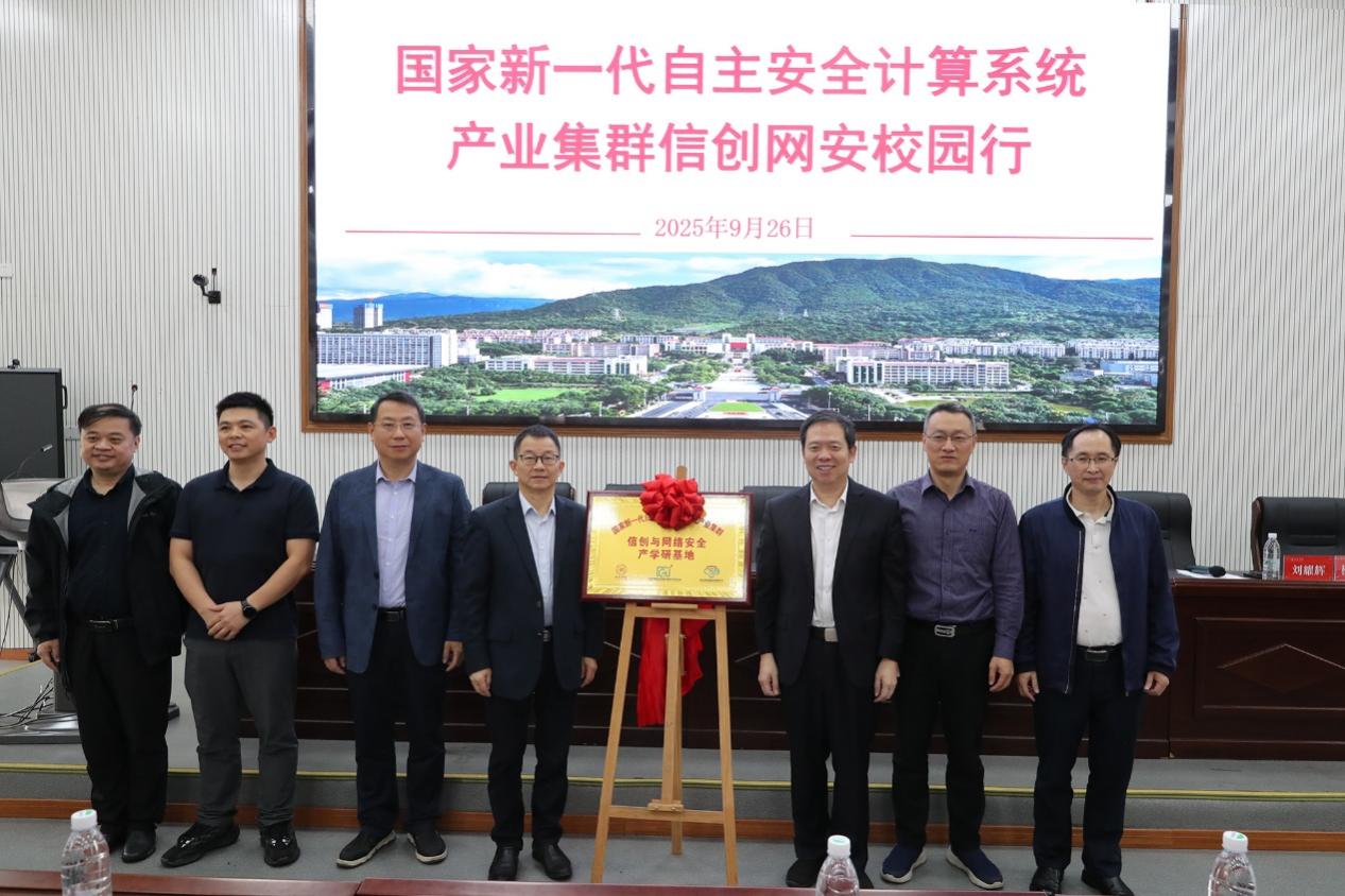 本网讯(通讯员 陈粲然 仇雪 摄影 佘伟灏) 9月26日,国家新一代自主安全计算系统产业集群信创与网络安全产学研基地签约暨揭牌仪式在我校隆重举行。校党委委员、副校长高守平,长沙市国链安全可靠计算机产业促进中心主任杨一艺、副主任何俊,湖南省网安基地科技有限公司副总经理熊勇,特邀专家国防科大副研究员杨程等出席活动。