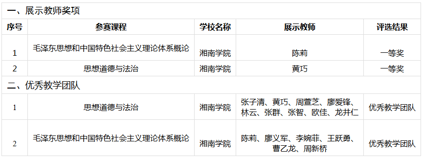 本网讯(通讯员 周莲英)近日,湖南省教育厅公布了《首届“潇湘杯”高校思政课教学展示活动评选结果公示名单》,我校马克思主义学院教师陈莉、黄巧斩获一等奖,张子清教学团队、陈莉教学团队获得“优秀教学团队”荣誉称号。