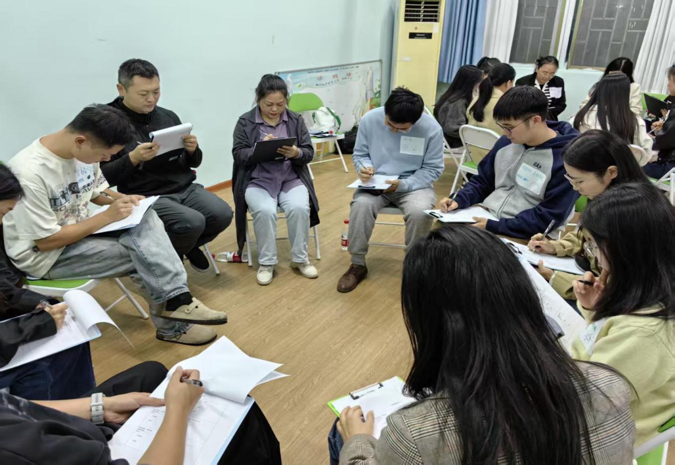 小组互动环节,教师们通过填写“压力圈”图与“自我探索”表,分享压力状态、明晰压力来源,在交流中探索应对压力的新思路;“戴高帽”活动里,大家轮流真诚赞赏同伴的个性优势,进一步强化积极自我认同;冥想环节中,大家戴上眼罩,向内探索,为未来应对压力积蓄心理力量。