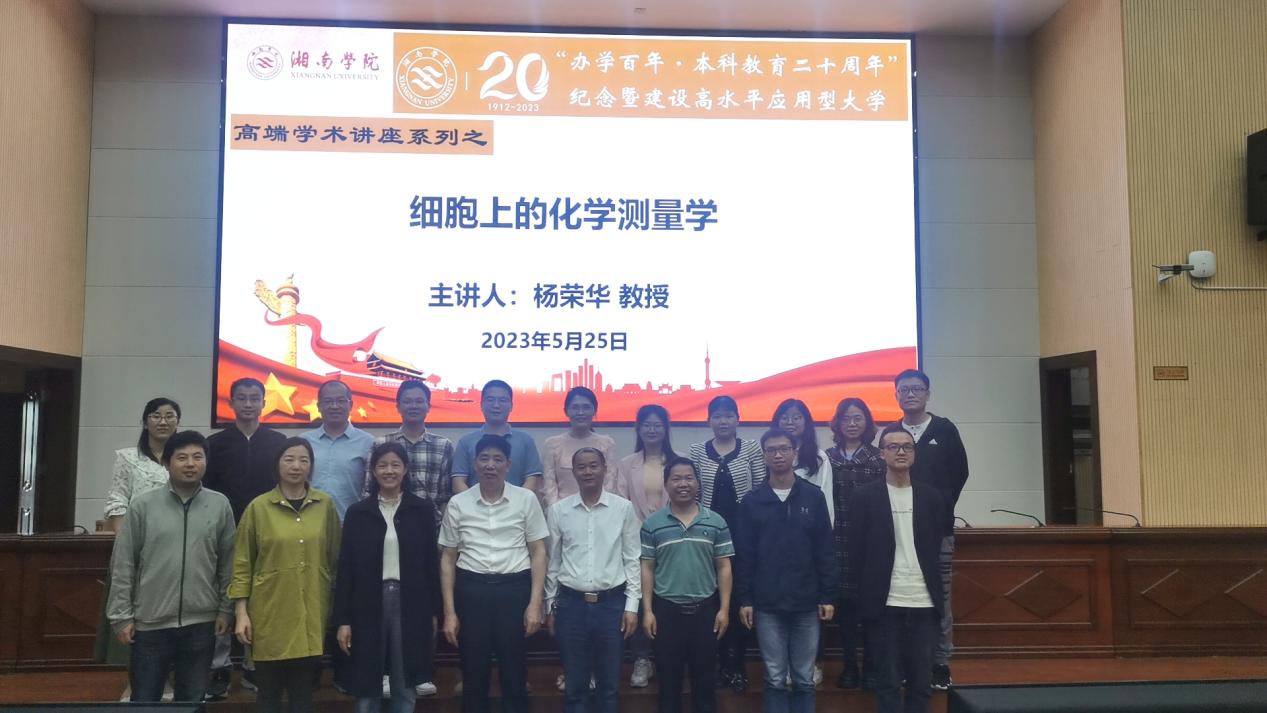 本网讯(通讯员 李冬冬 刘晶)5月25日上午,国家杰出青年基金获得者、教育部长江学者、生物传感与计量学国家重点实验室副主任、湖南大学化学化工学院教授杨荣华应邀来校在图书馆西报告厅为湘南学院师生做题为“细胞上的化学测量学”的学术报告。报告会由学科建设与研究生处处长邓斌主持,化学与环境科学学院院长叶丽娟、副院长刘晶、陈长中,学院师生参与此次学术讲座。