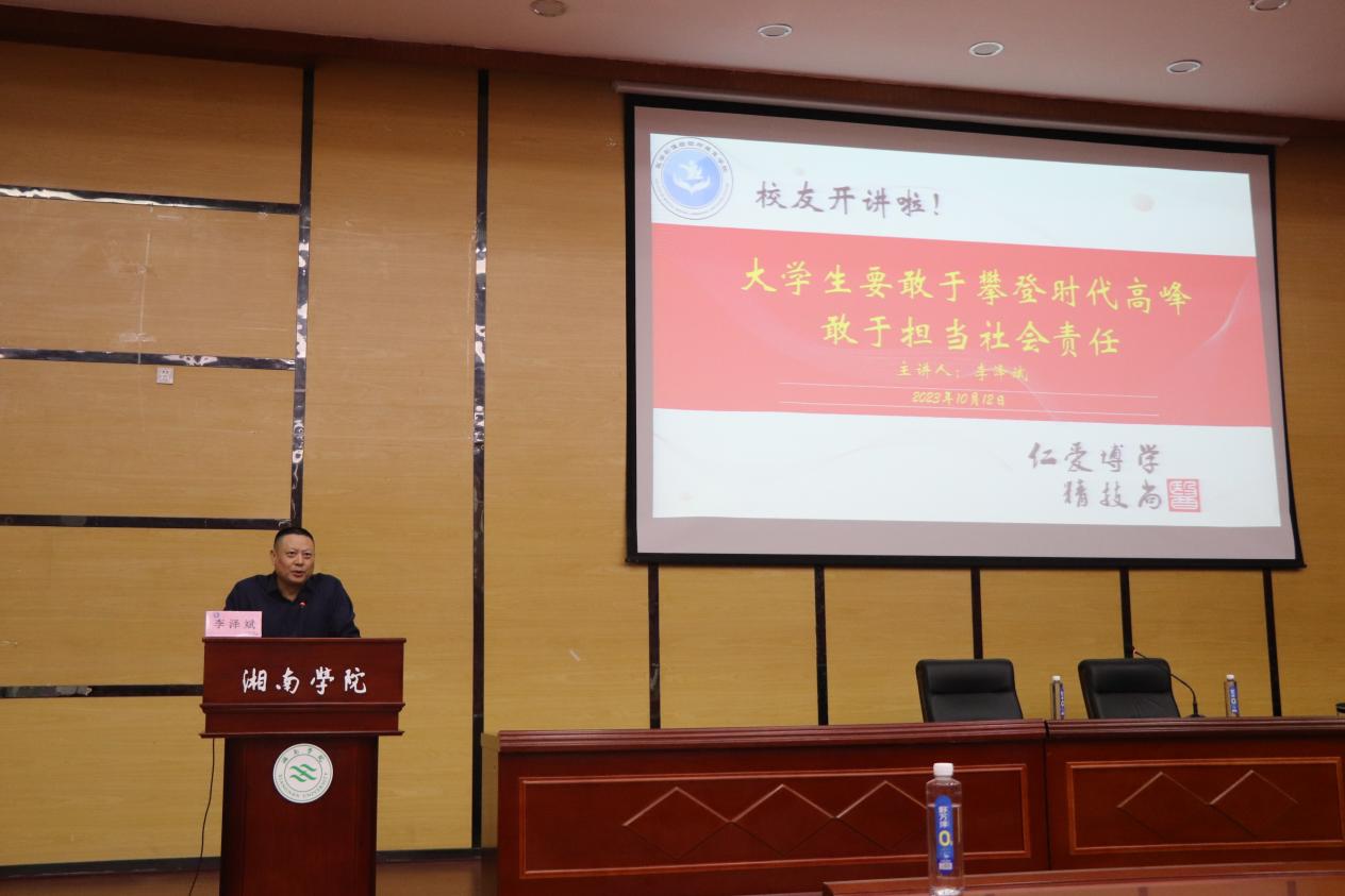 医学影像检验与康复学院邀请李泽斌在北湖校区四楼报告厅作题为“大学生要敢于攀登时代高峰,敢于担当社会重任”的讲座。李泽斌结合自身经历为学弟学妹们提供了学习、生活、就业等方面的指导并寄予厚望。他还多次捐款回馈母校并设立“泽斌助学基金”,用于资助医学专业学生成长成才。医学影像检验与康复学院易班工作站通过B站账号“湘南学院影检康小福星”,以线上直播方式实现学院在外实习生和在王仙校区的本院学生在线收看。