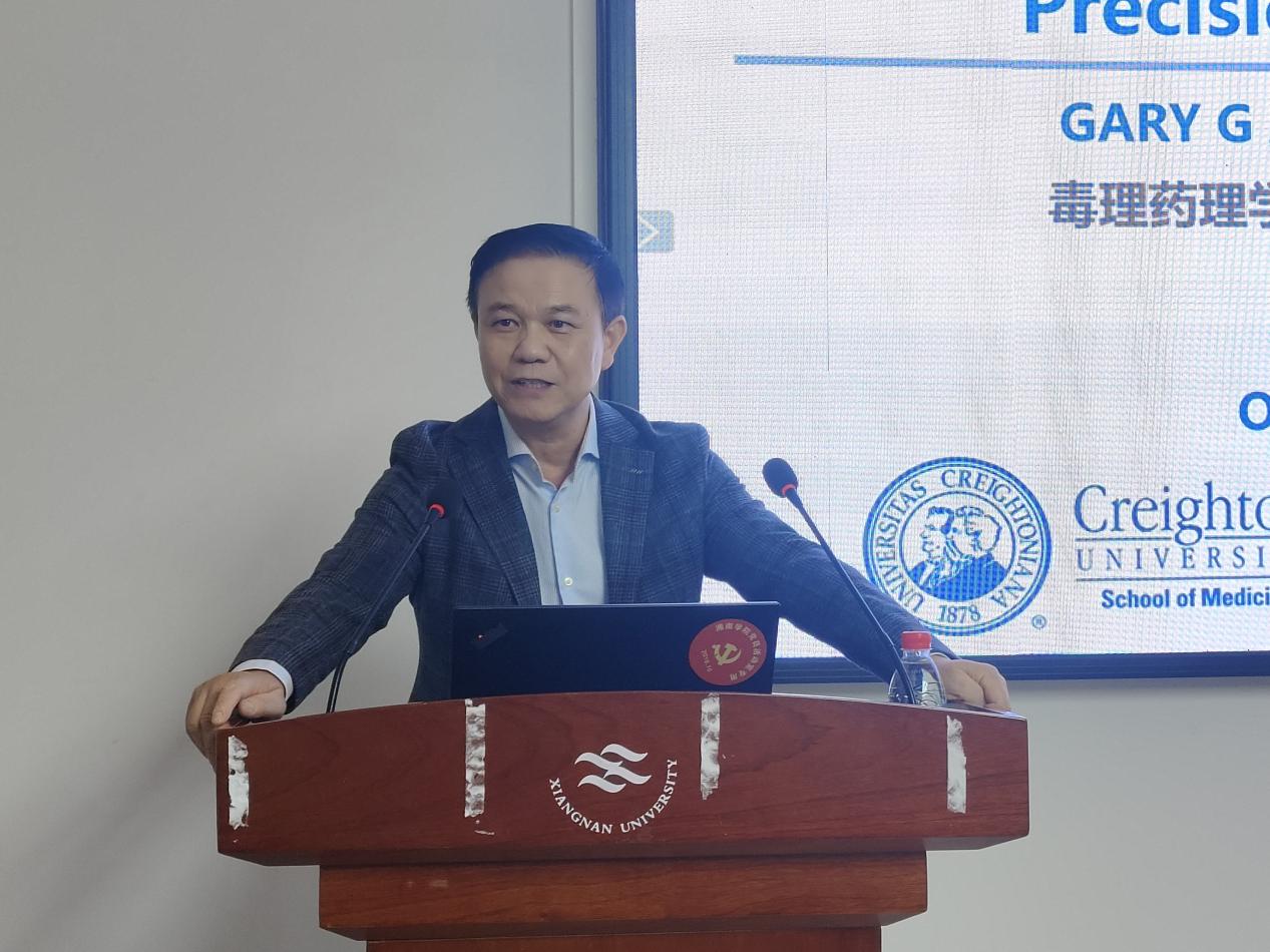 本网讯(通讯员 谭艳美 摄影 邓博文 罗书桐 何锦杰)为庆祝我校“办学百年、本科教育二十周年”纪念活动,10月31日上午,美国Creighton大学医学院终身教授、第十三批国家海外高端人才计划“海聚工程”计划千人学者、国家科技进步突出学者年度人物、科技部国际重大合作研究计划首席科学家、美国NASA生物医学基金委(Bone session)终审评委、国家自然科学基金委终审评委肖桂山于美术与设计学院101会议室开展主题为“肿瘤微环境与精准诊疗”的学术讲座。基础医学院副院长方会龙主持,学院教职工和学生代表60余人参会。