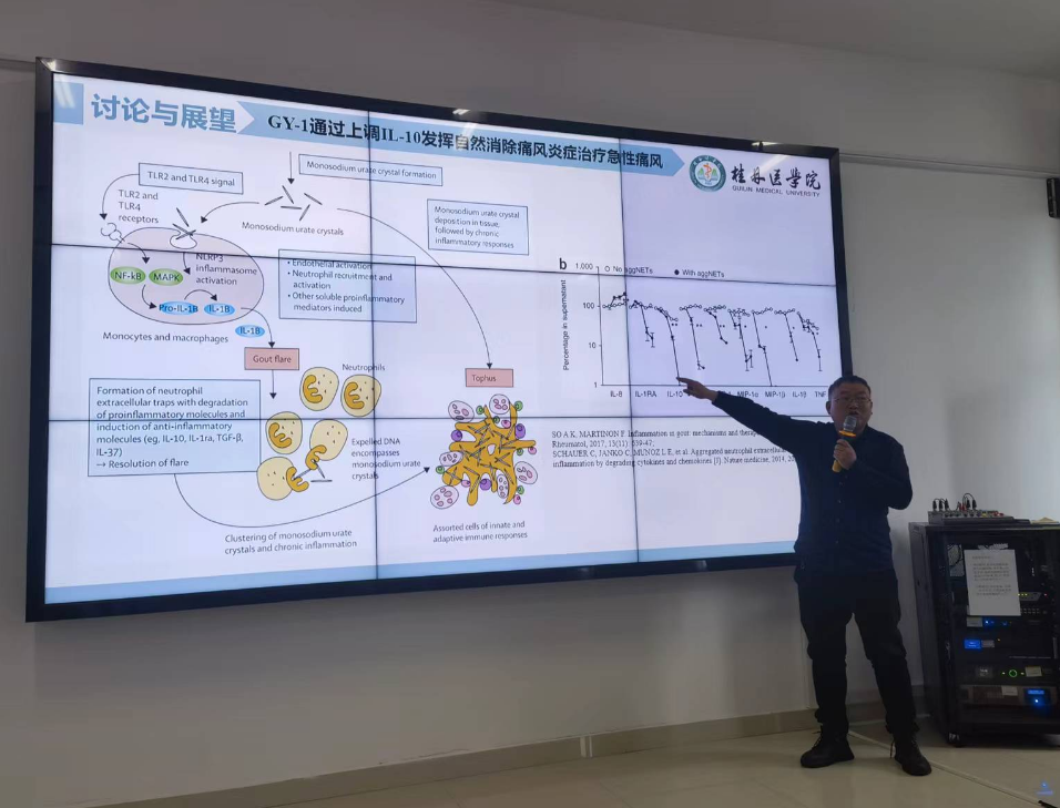 本网讯(通讯员 史林飞)3月19日下午,医学影像检验与康复学院邀请北京大学前沿交叉学科研究院理学博士,东南大学与桂林医学院附属医院联合培养博士后,国家高校创业指导师周益装在北湖校区1605会议室作“副干酪乳杆菌GY-1对秋水仙碱治疗急性痛风的减毒增效作用及机制”科研讲座。