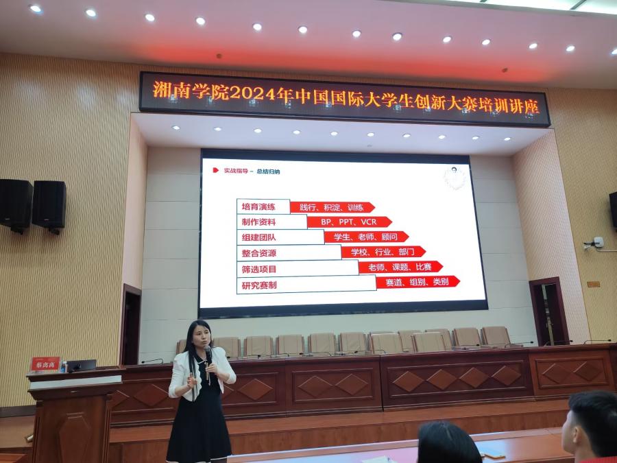 本网讯(通讯员 韦雅光)5月30日,我校在图书馆西报告厅举办了2024年中国国际大学生创新大赛培训讲座。本次讲座特邀湖南开放大学导师蔡离离来我校讲学,创新创业学院院长李翔主持讲座。