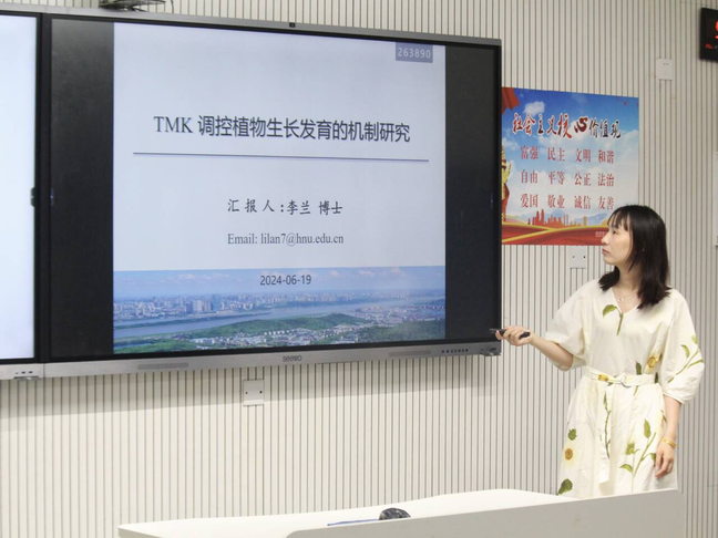 李兰以《TMK 调控植物生长发育的机制研究》为题,结合自身的科研经验和研究成果,以TMK功能的多样性为切口,详细阐述了TMK调控植物生长发育的机制,深入浅出地讲解了研究的最新动态和前沿技术,引起了与会人员的广泛关注和热烈讨论。