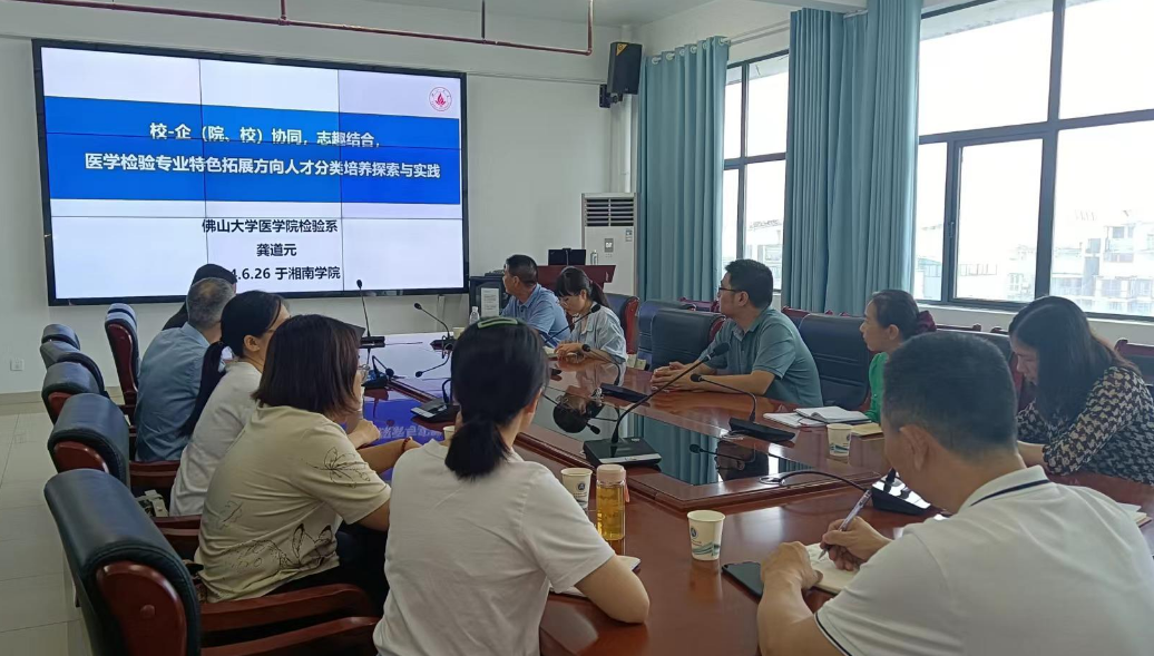 本网讯(通讯员 姜成红)6月26日下午,医学影像检验与康复学院邀请佛山大学医学院检验系主任龚道元教授做以“校-企(院、校)协同,志趣结合,医学检验专业特色拓展方向人才分类培养探索与实践”为题的讲座。学院院长李庆、医学检验技术专业带头人及骨干教师参会,会议由副院长胡芳主持。