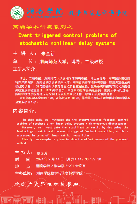 【讲座预告】 Event-triggered control problems of stochastic nonlinear delay systems