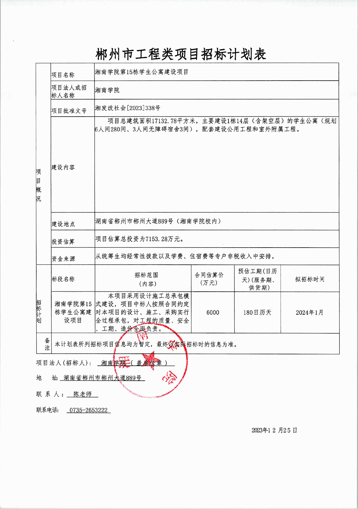 湘南学院第15栋学生公寓建设项目招标计划公示(郴州市工程类项目招标计划表)