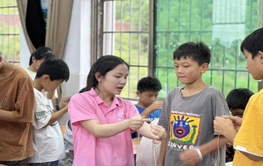 图为实践队员教学生编制五彩绳