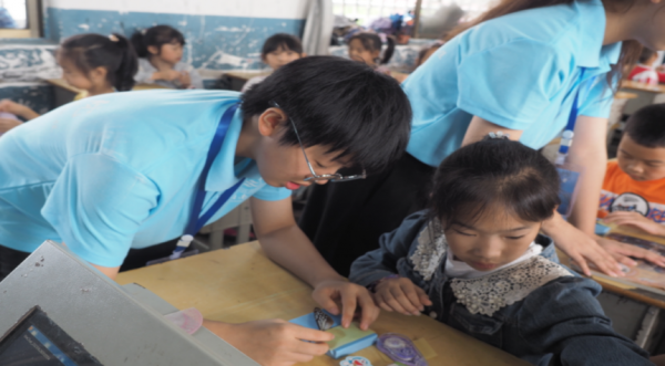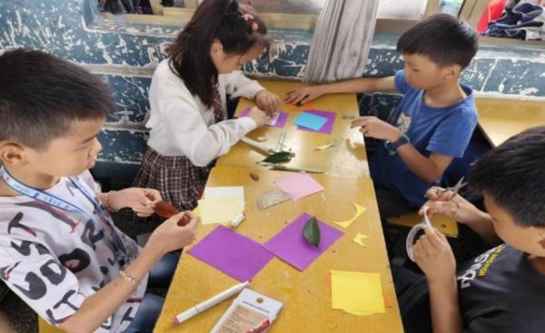 图为团队助教老师帮助孩子们完成蝴蝶标本的制作