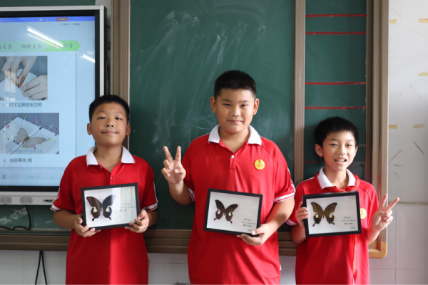 图为三完小学生与蝴蝶标本合影