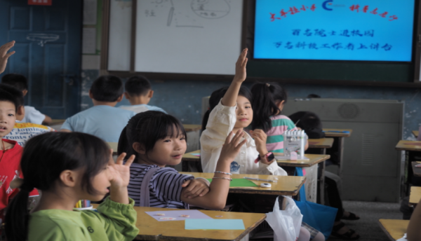 图为良田小学三年级学生积极举手回答老师的问题