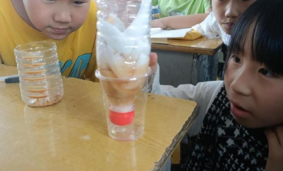 图为小朋友们利用自己制作的简易净水装置等待过滤水流出