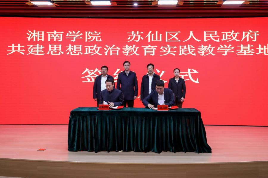 在与会人员的见证下,邹宏如、吴文明共同为“湘南学院思想政治教育实践教学基地”揭牌。刘卫平、于伟分别代表校地双方签订合作协议。