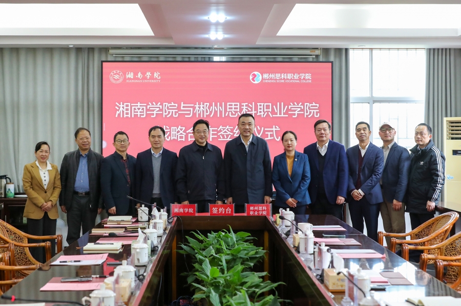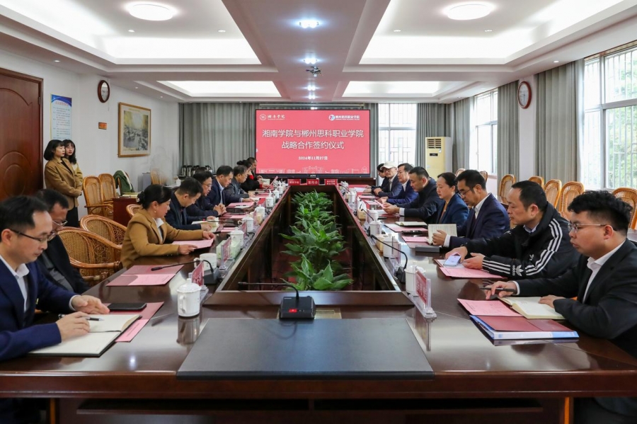 本网讯(通讯员 李冰婧 陈雨薇 摄影 佘伟灏 徐昊煊)11月27日上午,我校与郴州思科职业学院签订战略合作协议,签约仪式在2号办公楼3楼会议室举行。我校党委书记邹宏如,党委副书记、校长雷小勇,党委委员、副校长高守平,党委委员、副校长李和生,郴州思科职业学院董事长瞿启云,党委书记、督导专员王晖玲,常务副校长雷久相,党委副书记陈华仁出席签约仪式;我校副校长贺莉萍主持签约仪式。