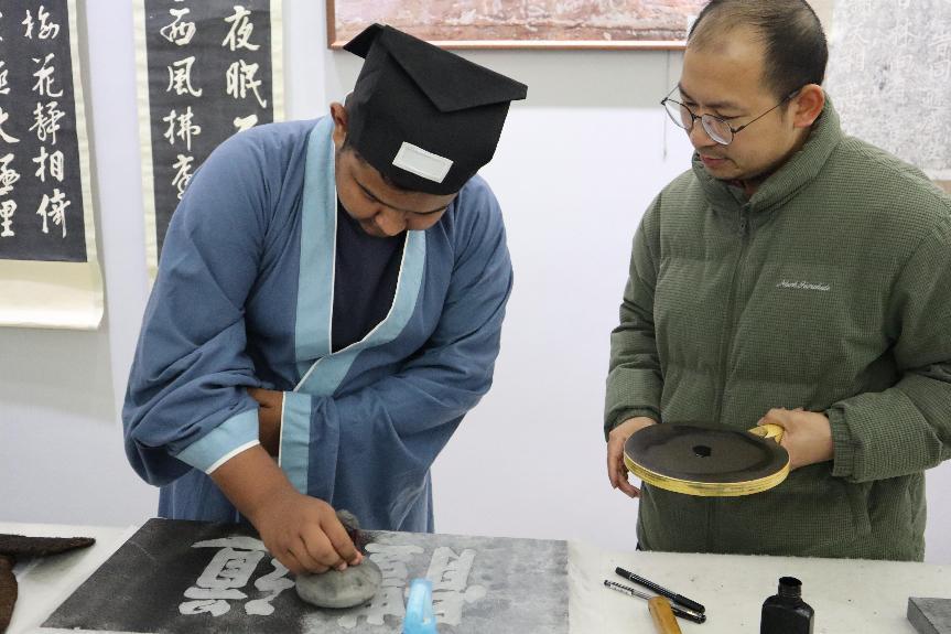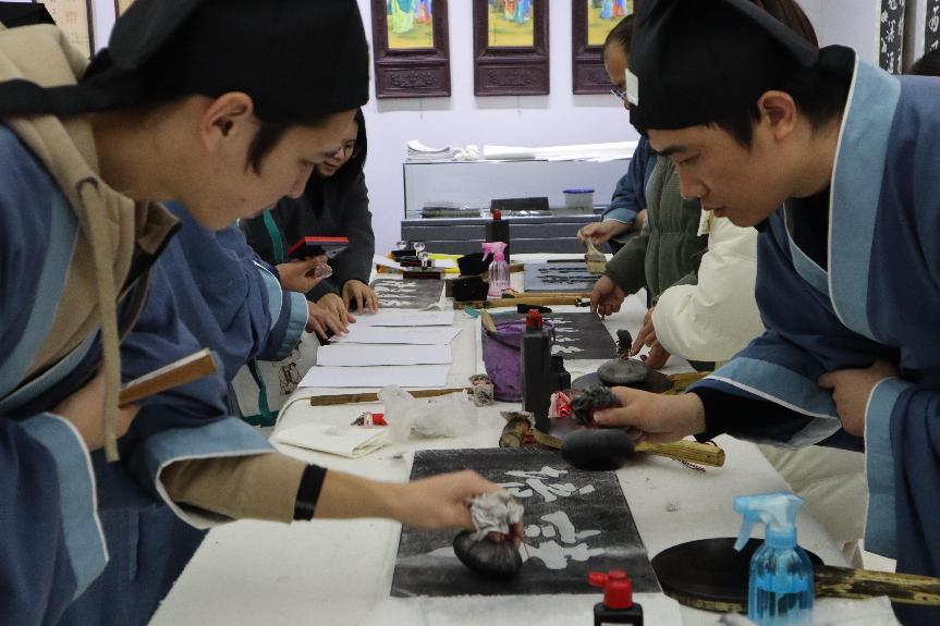 此外,留学生们还亲手尝试了拓片技艺,这一古老的艺术形式让他们深切感受到了中国古代文字与艺术的无穷魅力。在学院老师的悉心指导下,他们小心翼翼地拓印,每一次轻拍、每一次拓染都蕴含着对中华文化的敬畏与热爱。