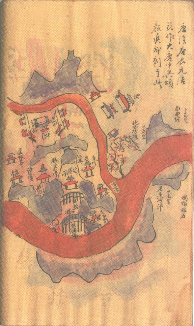 2.《北使程图》,今存抄本一种,自越南至中国京城的使程地图集,本书收188幅朱墨两色彩图,有昭德台、幕府营、燕京等地,每幅皆注有地名、历史遗迹。巴黎馆藏编号MF.53。